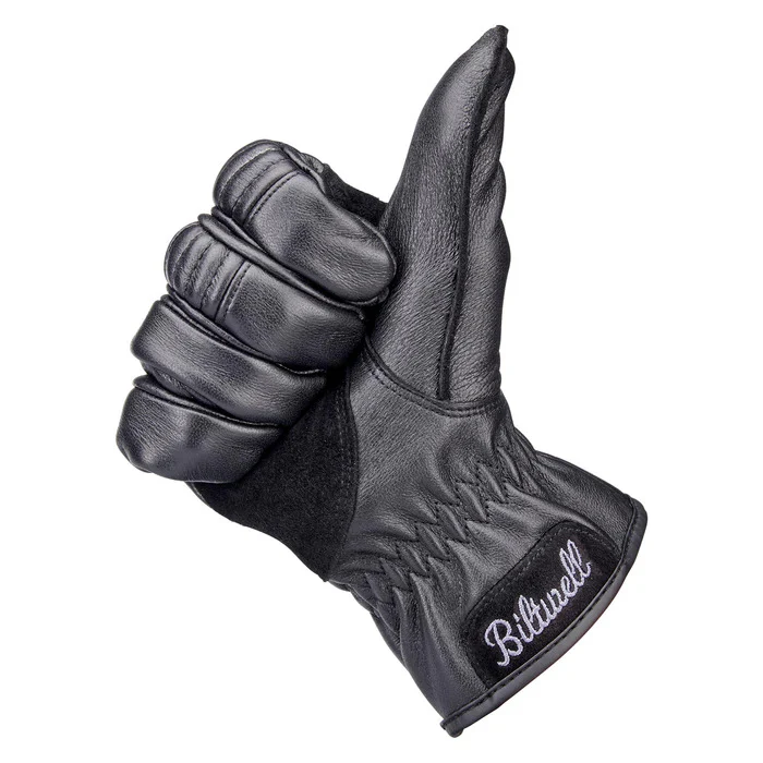 The Biltwell Work Gloves are the type of timeless gloves that everyone needs a set of. Featuring articulating index and middle fingers, the Biltwell Leather Work Gloves achieve excellent flexibility during two-finger clutch and brake actuation. The double-thick leather palms are reinforced for maximum abrasion resistance and have light padding at anatomical pressure points for comfort and shock isolation. The open cuffs have elastic gathers and adjustable embossed leather tabs for easy glove-to-hand installation and a perfect fit. For the rider looking for cold-weather gloves that look good and just works, the Biltwell Work Gloves are ready to roll.
