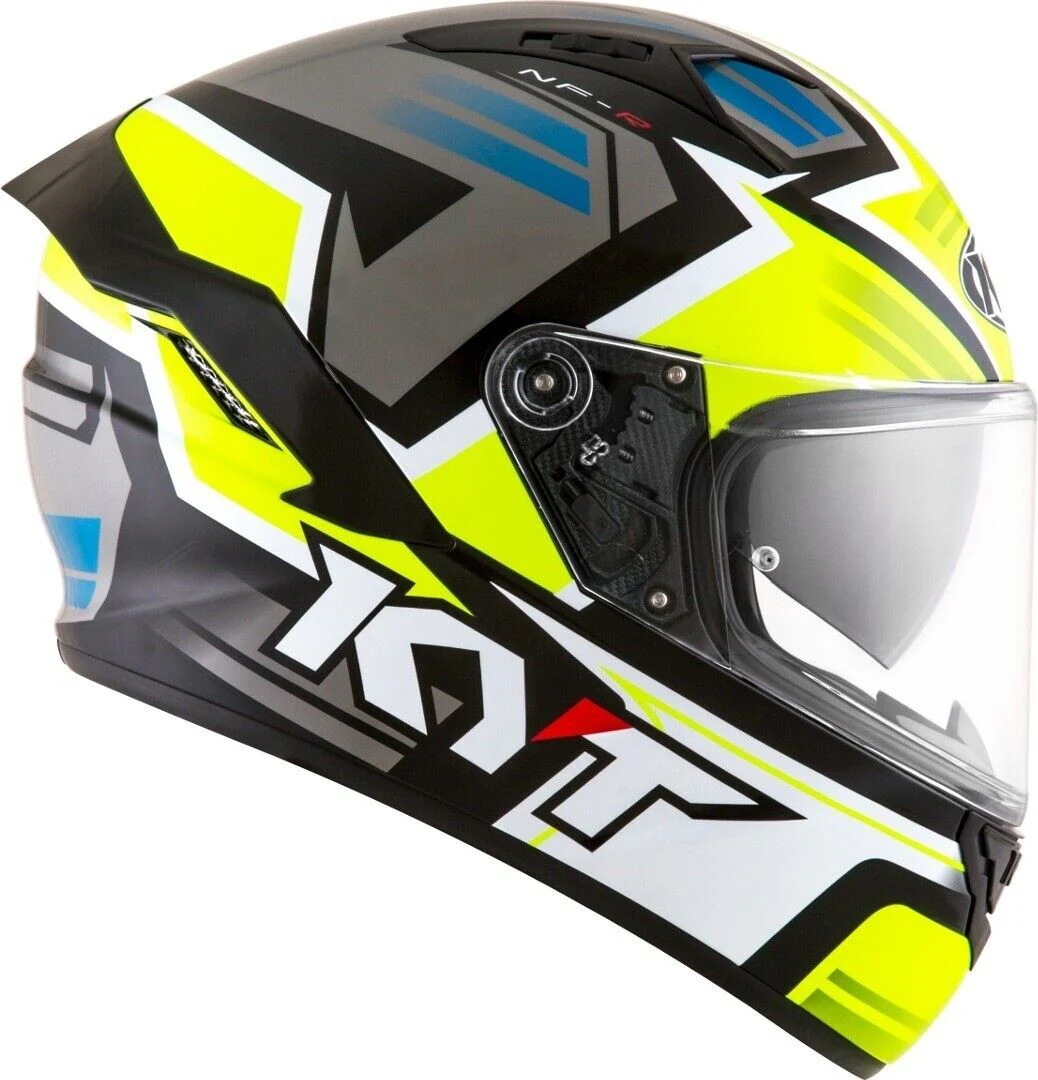 The NF-R, the full face helmet, spearhead of KYT for the sport touring sector. R&D department stared an ambitious journey to balance the features of a racing helmet with the essential touring and urban need. Effective ventilation, aerodynamic spoiler and restrained weights match with a comfortable and natural fit, a micrometric retention system and double ADV shell. Equipped with Optical Class 1 visor combined with Pinlock MaxVision and sun visor.